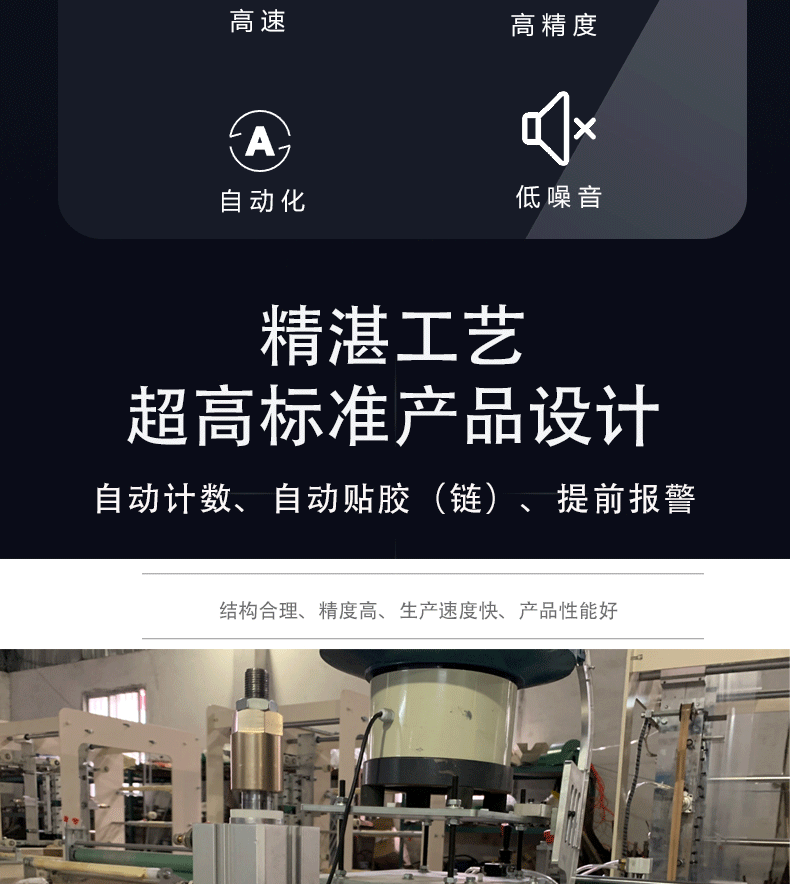 * 本機(jī)備有氣動(dòng)打孔,氣動(dòng)沖手挽,超聲波封口等功能,操作方便簡單、速度快、生產(chǎn)的產(chǎn)品尺寸精確,封線牢固美觀,質(zhì)量穩(wěn)定,自動(dòng)化程度高的特點(diǎn)。