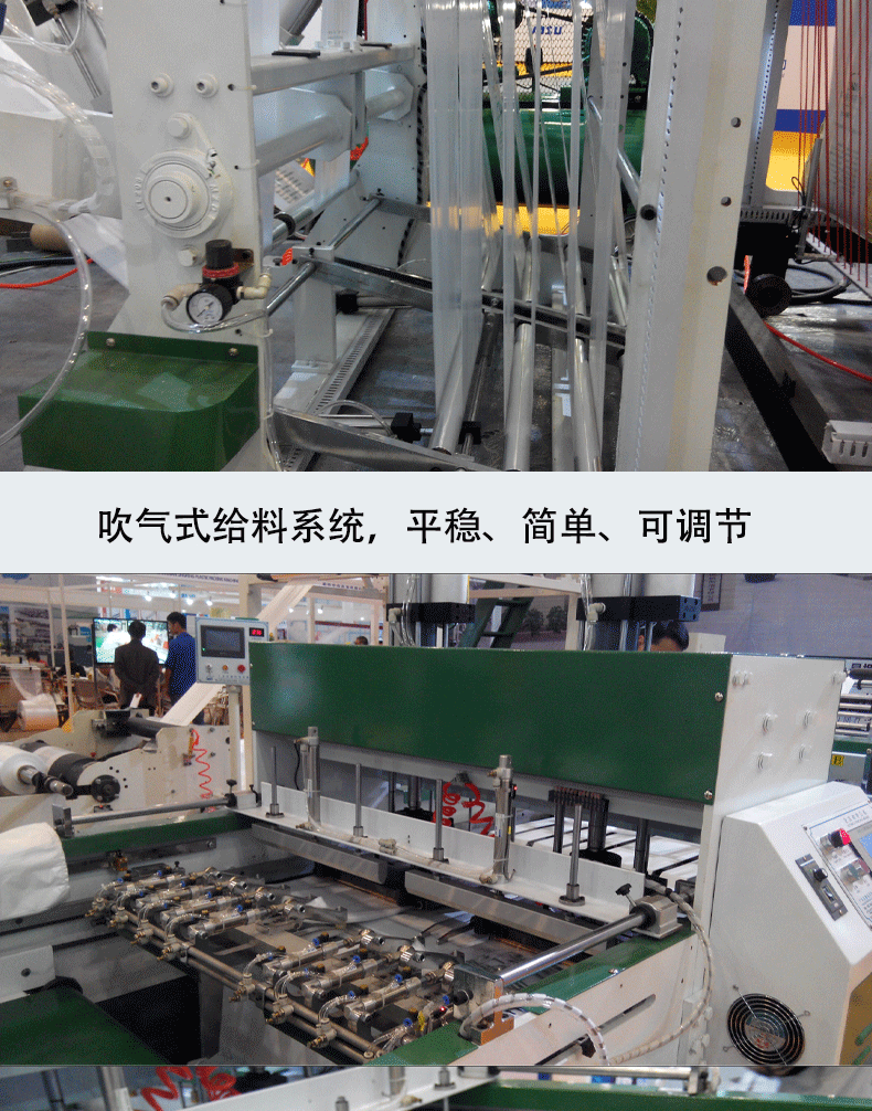 *吹氣式出料系統(tǒng),袋底整型設(shè)計,自動沖床采用油壓控制,廢料集中輸送收集,易于整理,操作簡單,具有無料、斷料、堵料自動停機(jī)功能。